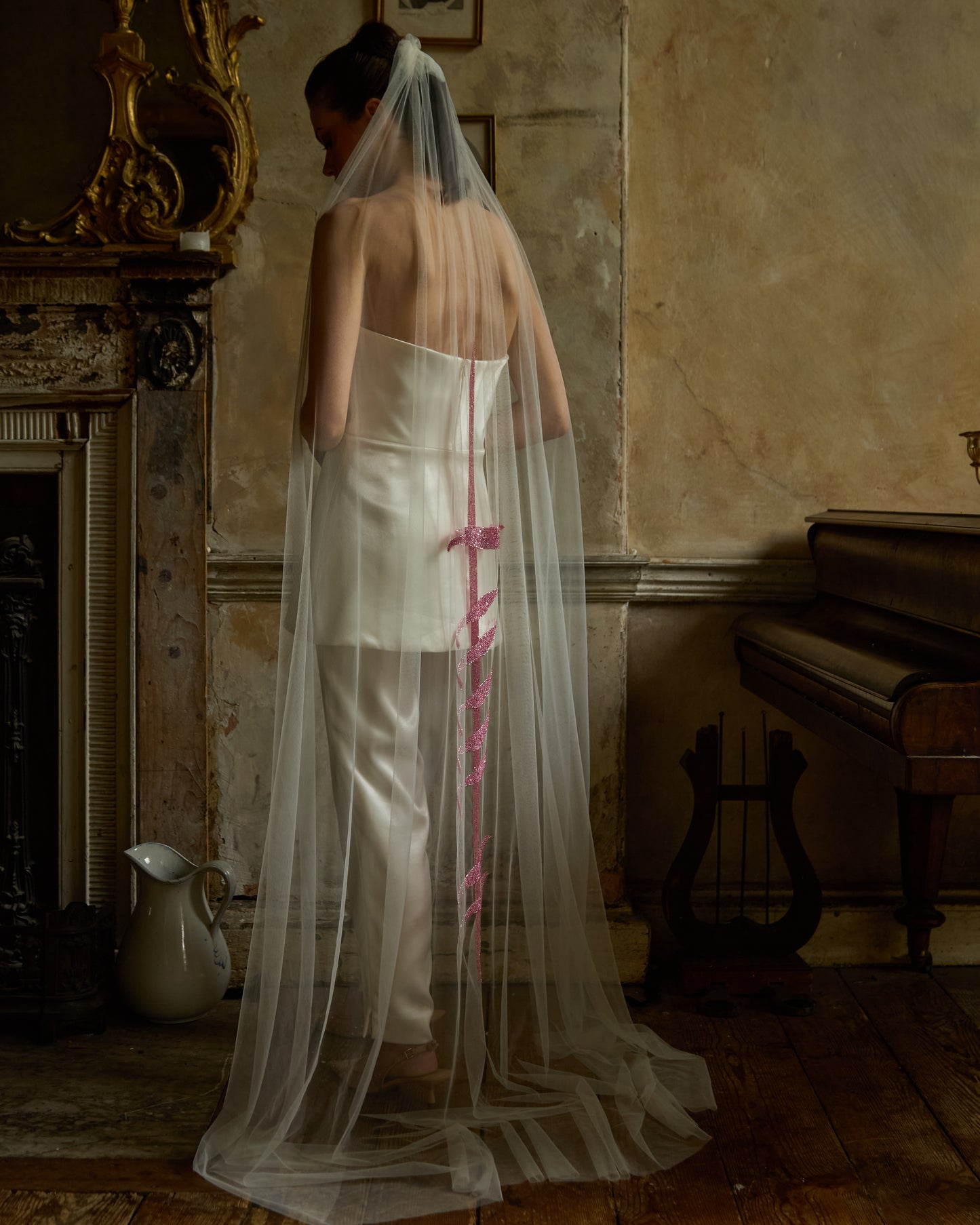 Featuring the word Grá delicately embroidered in Ogham script — Ireland’s oldest form of writing — this veil is designed for the bride who wants her wedding look to carry personal meaning. Whether you’re rooted in Irish tradition or simply feel connected to its spirit, this is a piece that lets you wear your heart, your culture, and your story.
