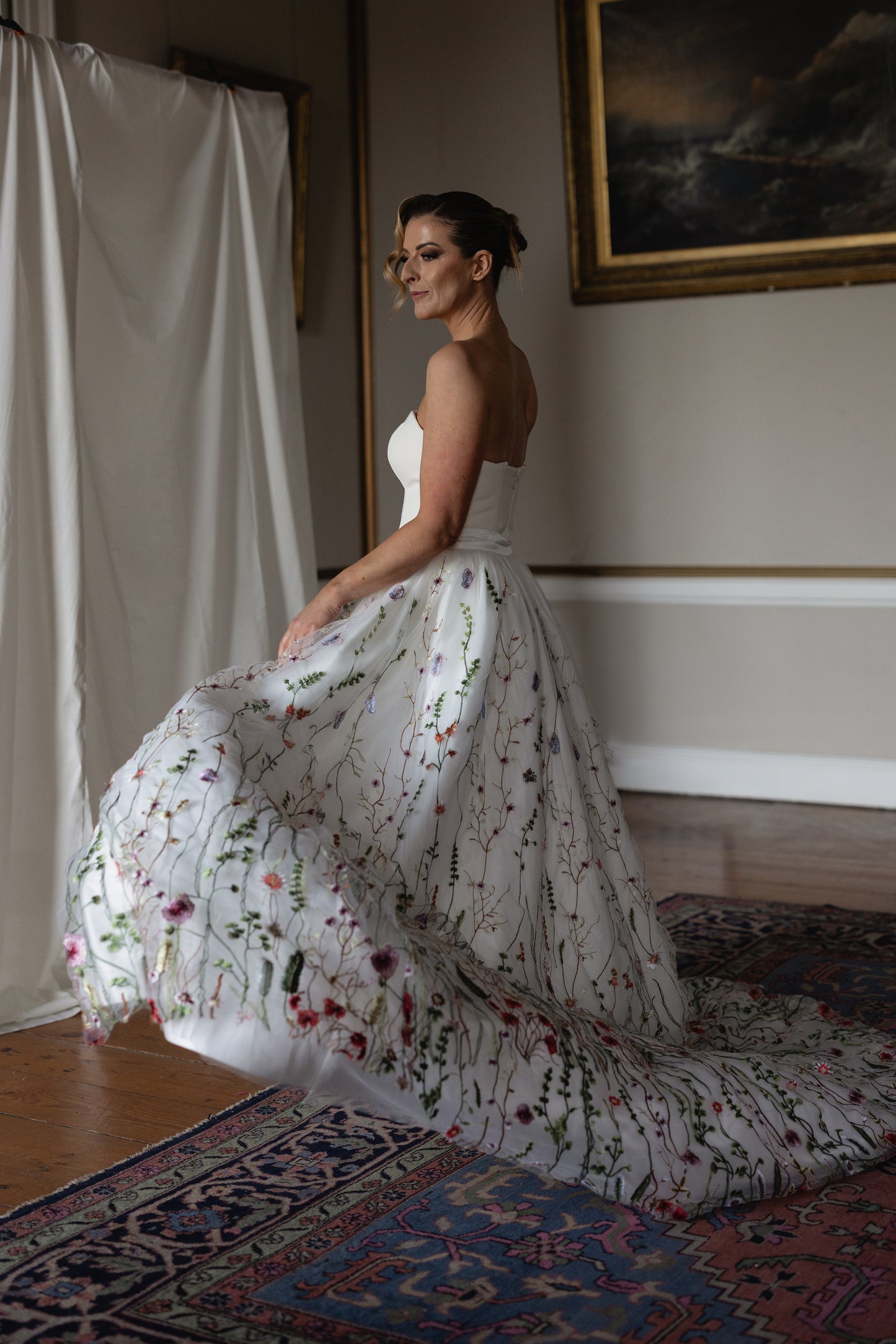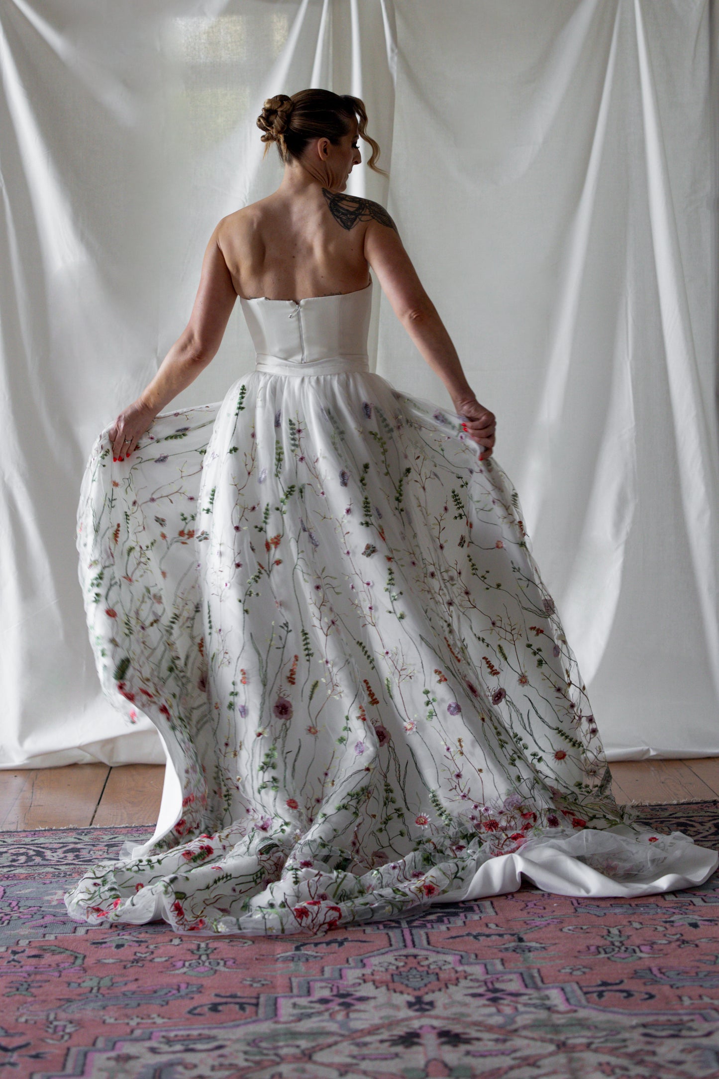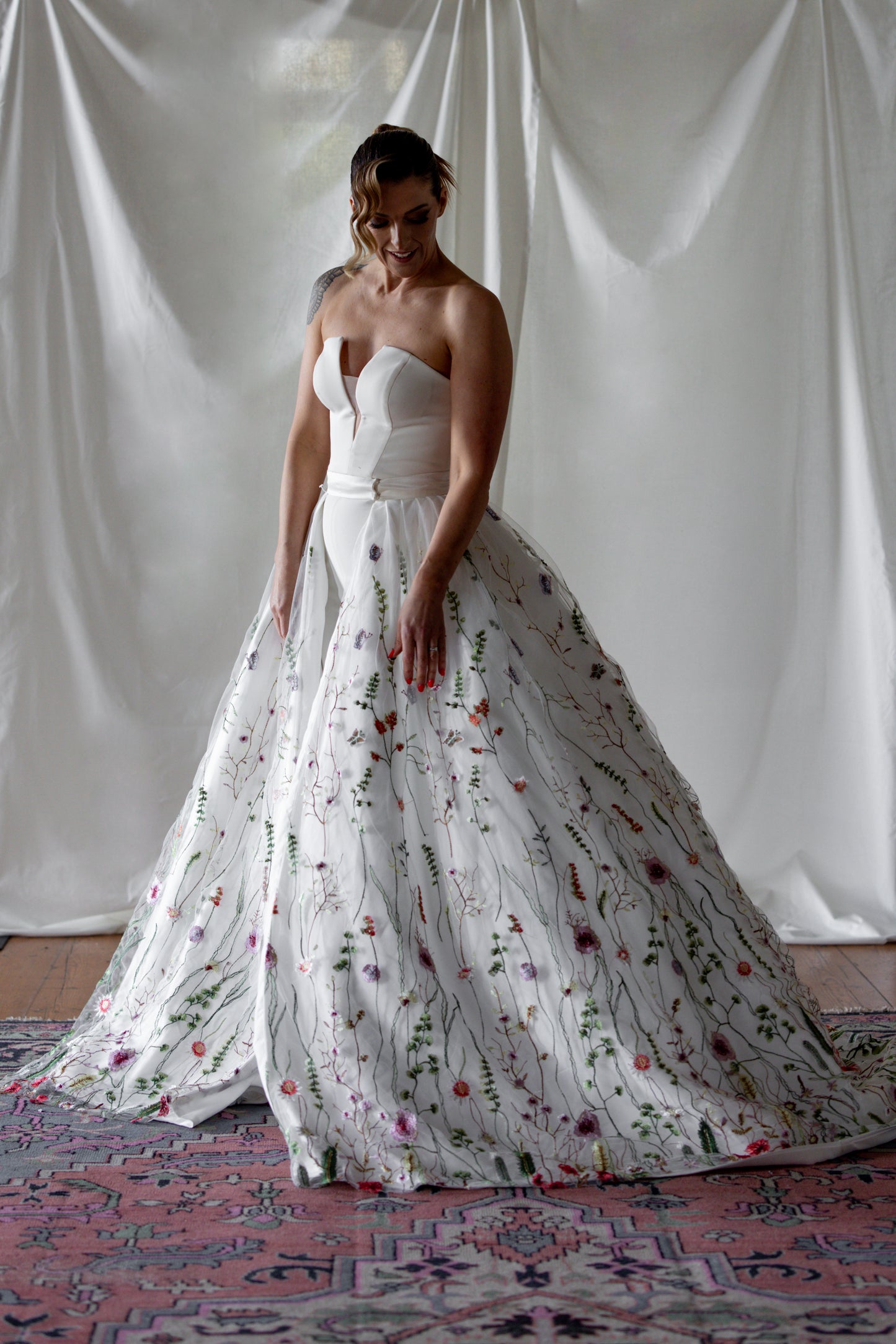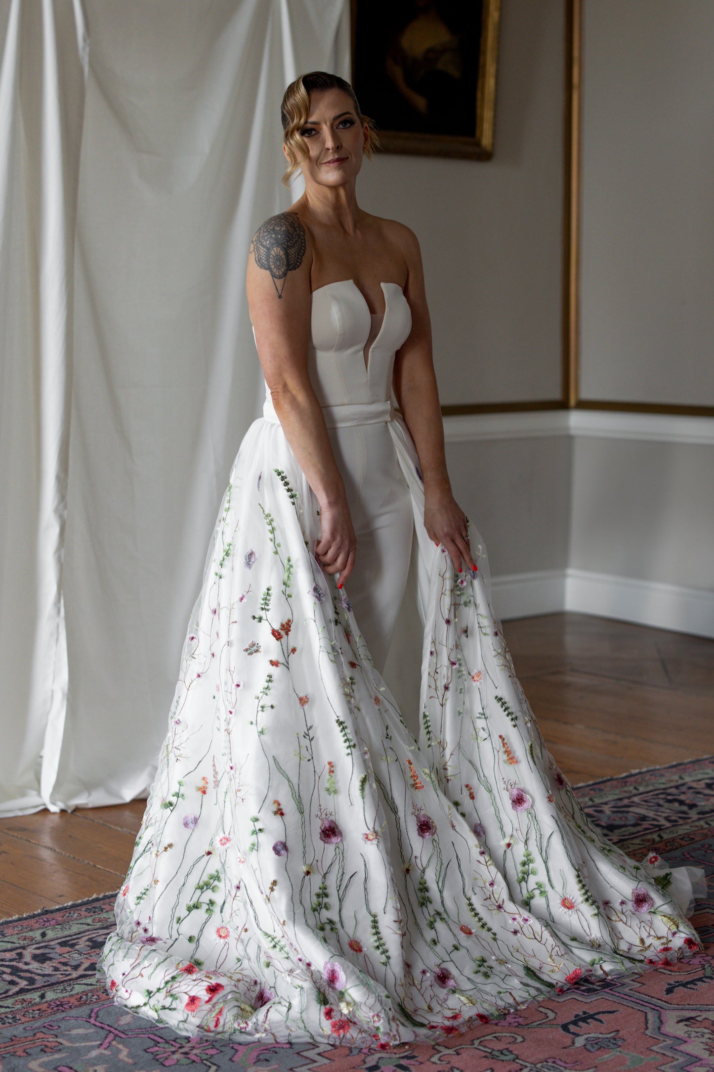 Floral embroidered wedding overskirt with multicoloured botanical lace detailing, styled over a strapless satin bridal gown — modern couture by Mizz Rio in Ireland