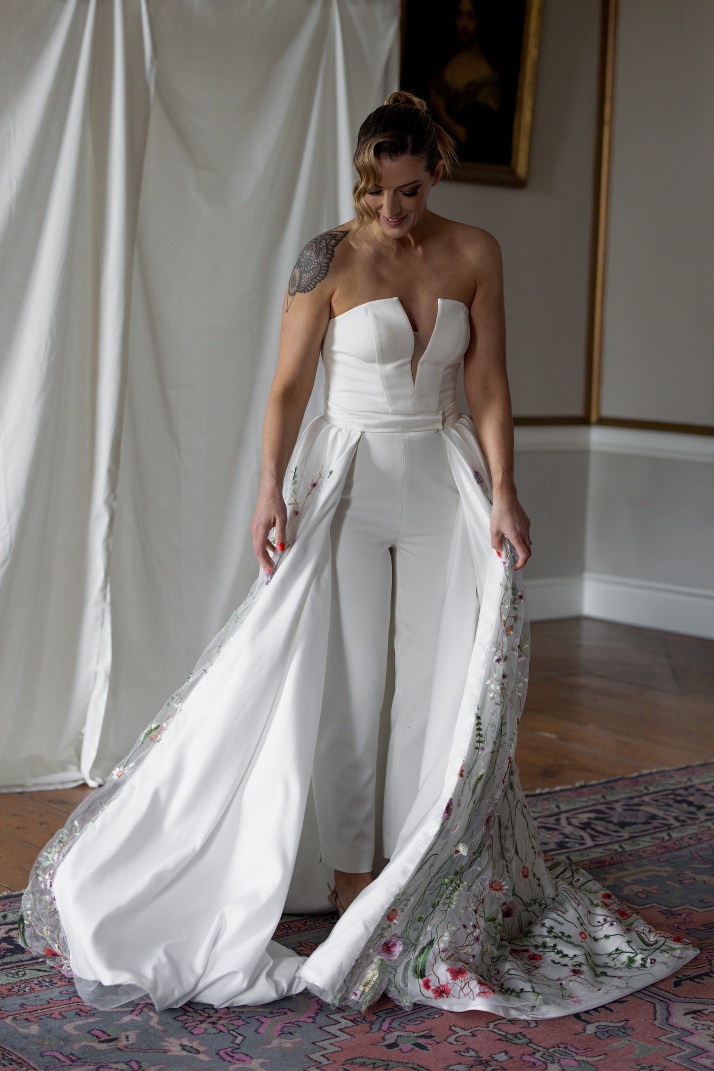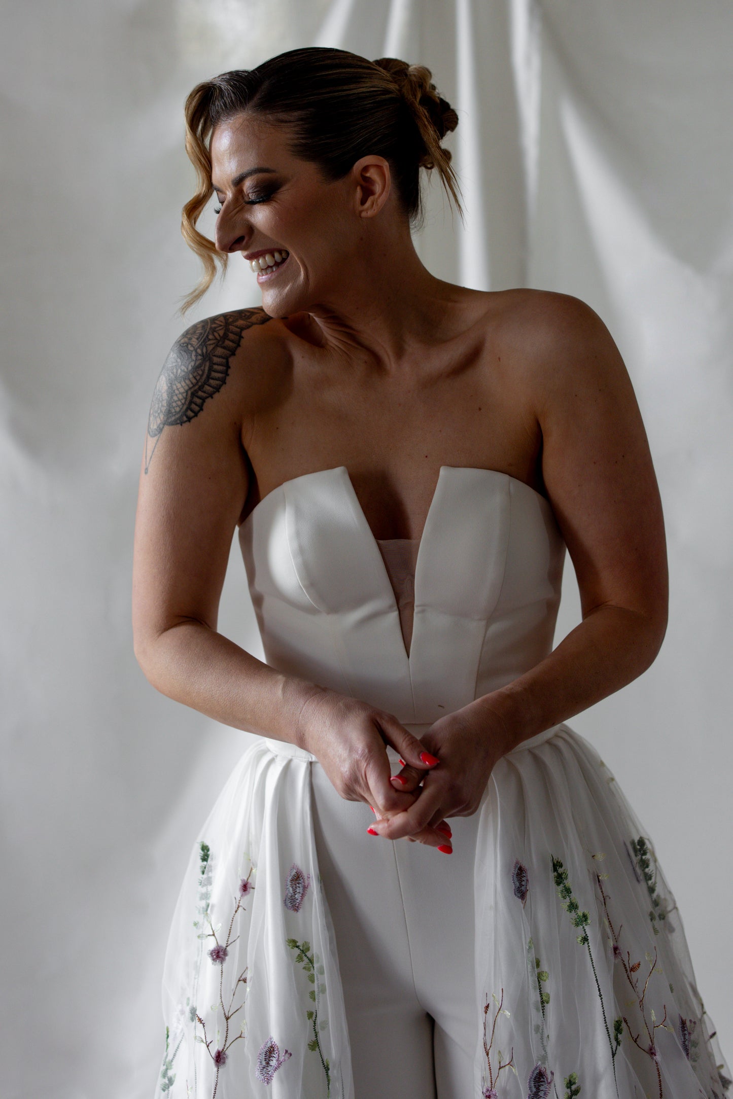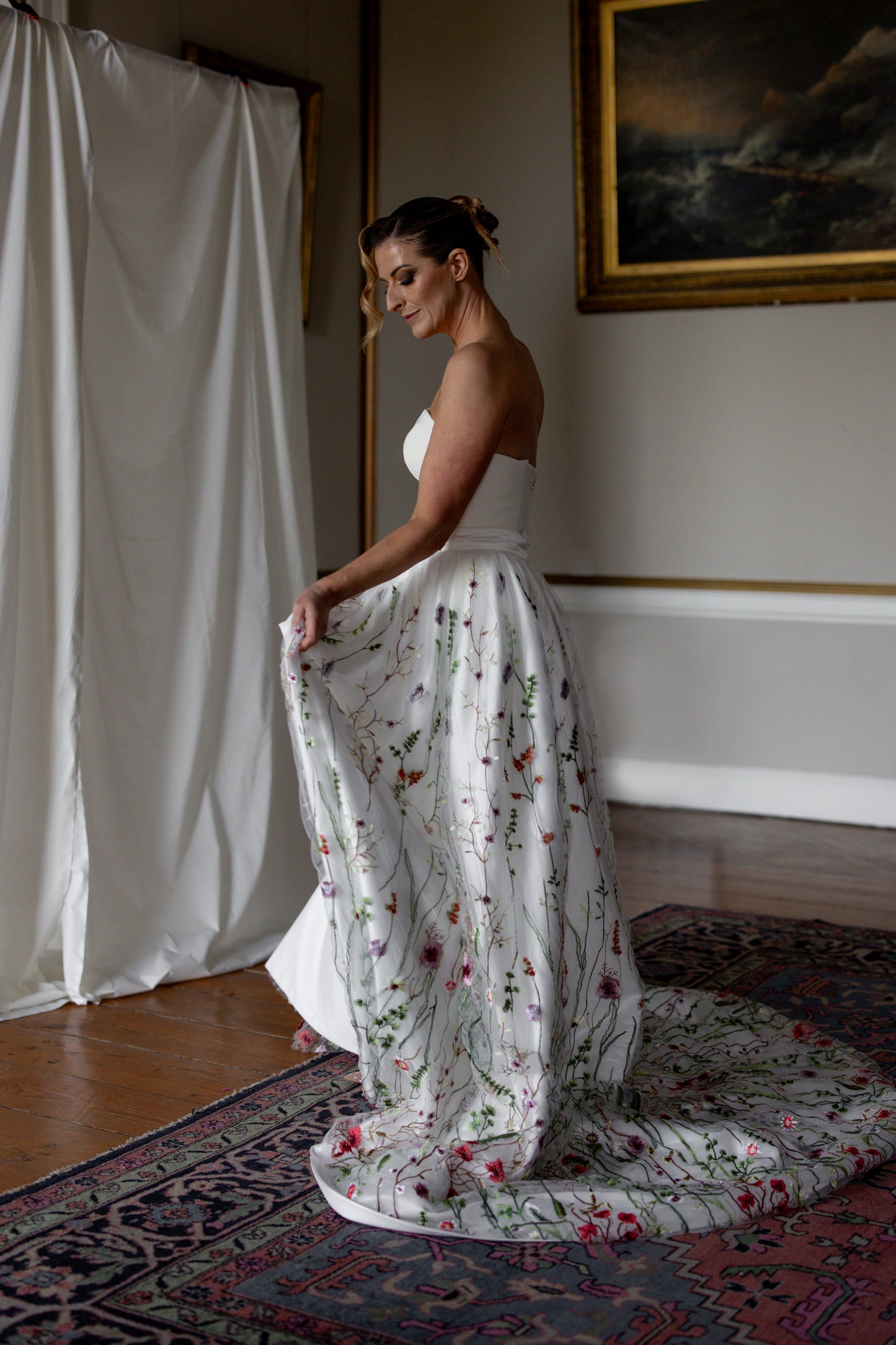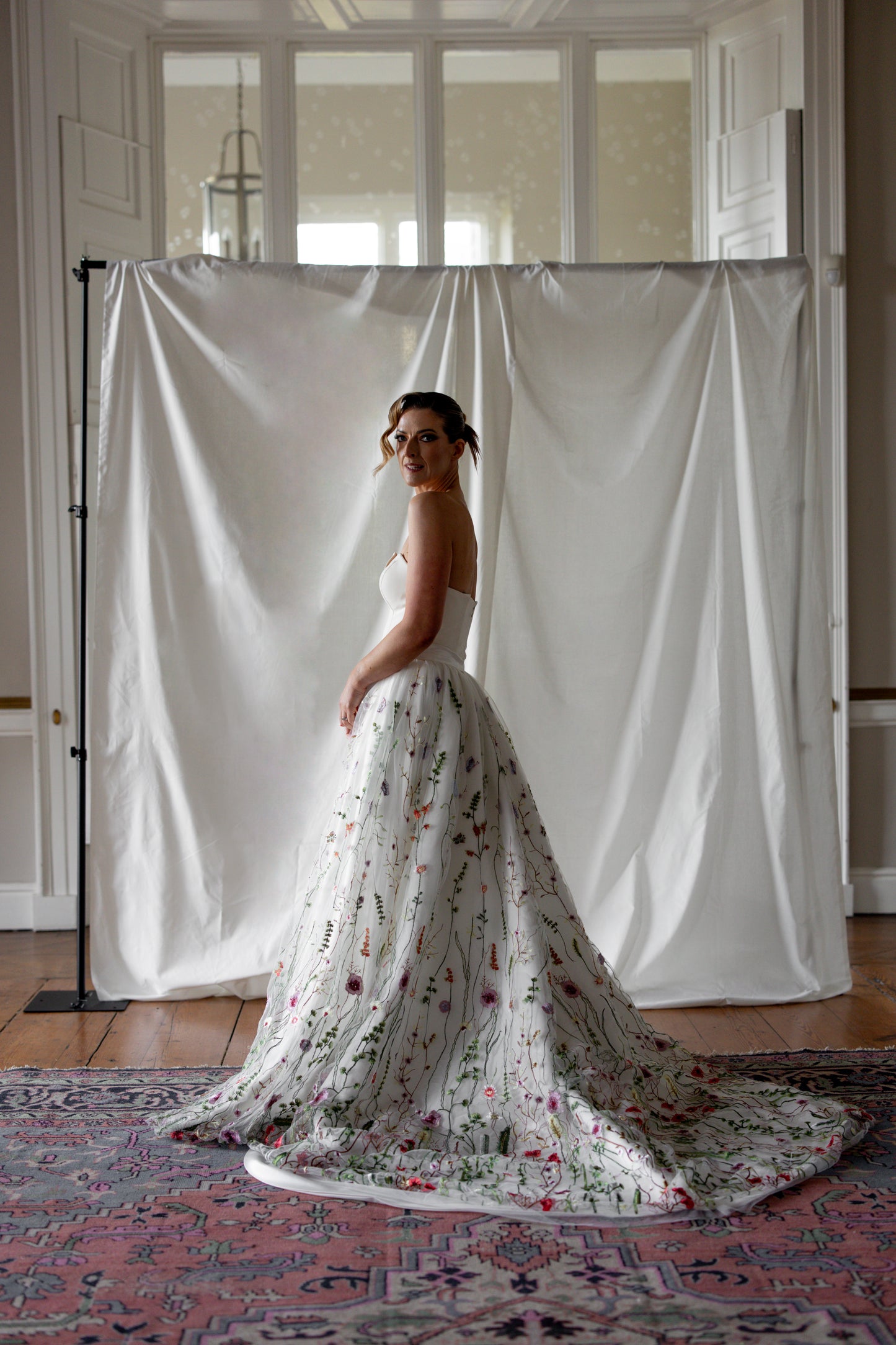 Floral embroidered wedding overskirt with multicoloured botanical lace detailing, styled over a strapless satin bridal gown — modern couture by Mizz Rio in Ireland