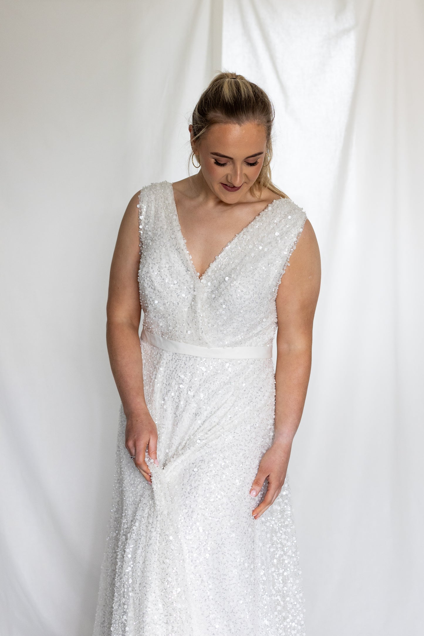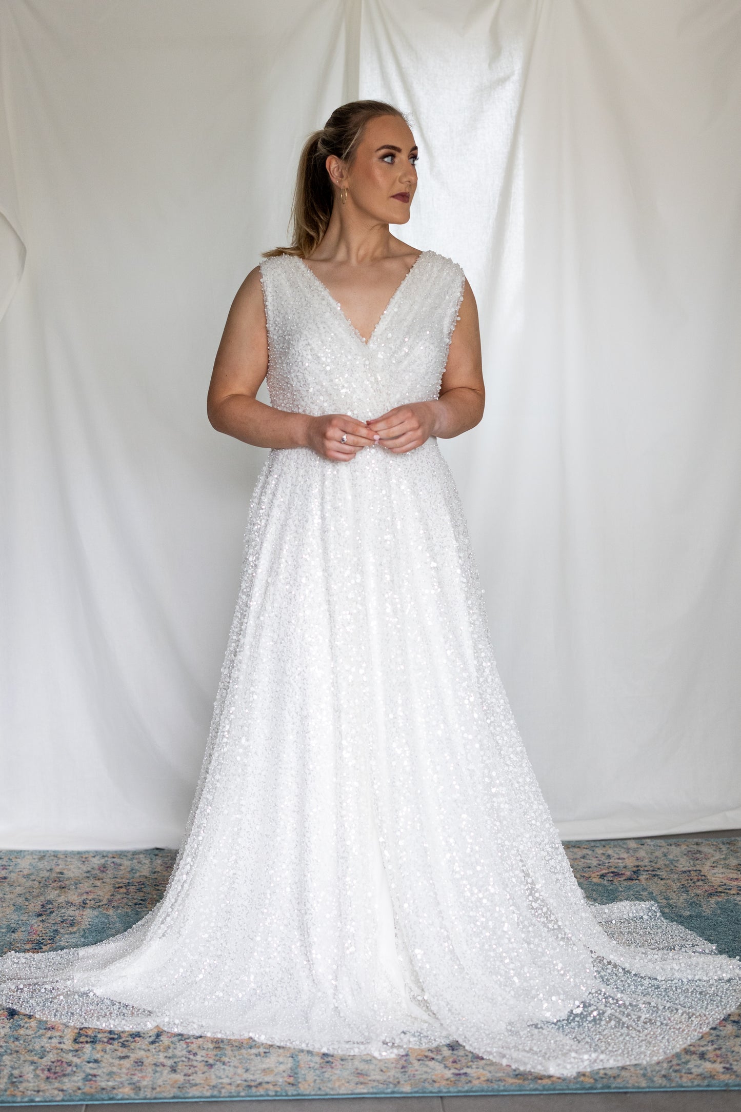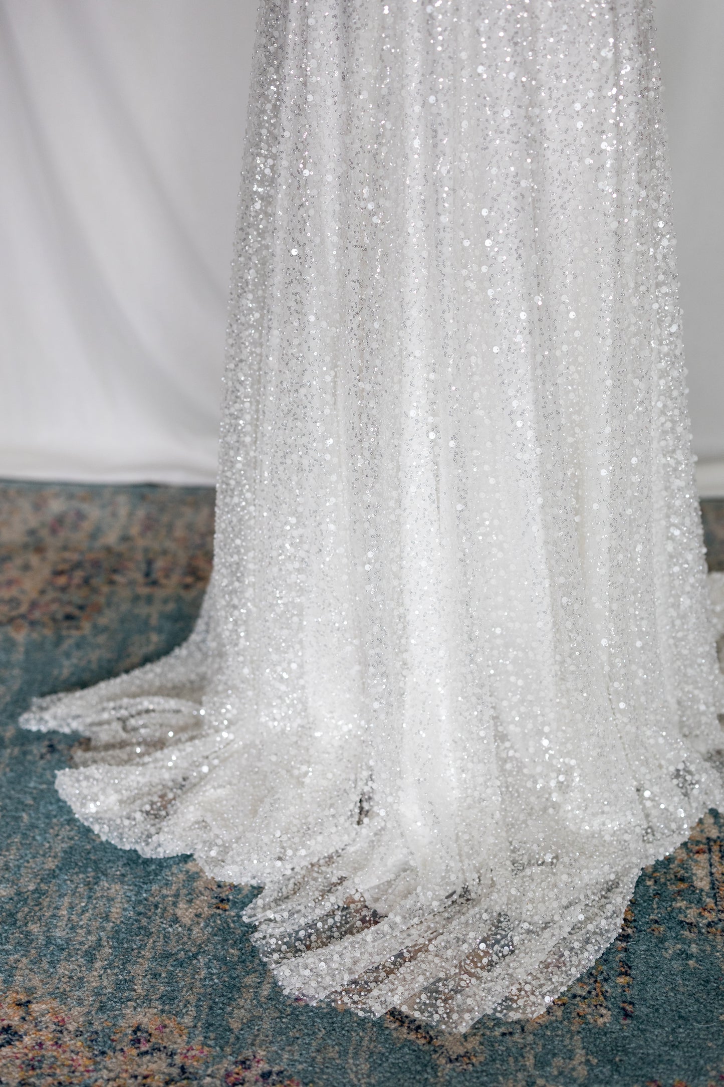 Crafted from sequin and beaded lace, this wrap-style dress shimmers with every movement. The high waistband defines the silhouette, while a front slit and slight train add fluidity and drama. Light-catching and refined, it’s a modern silhouette elevated with intricate detail—perfect for the bride who wants to shine.