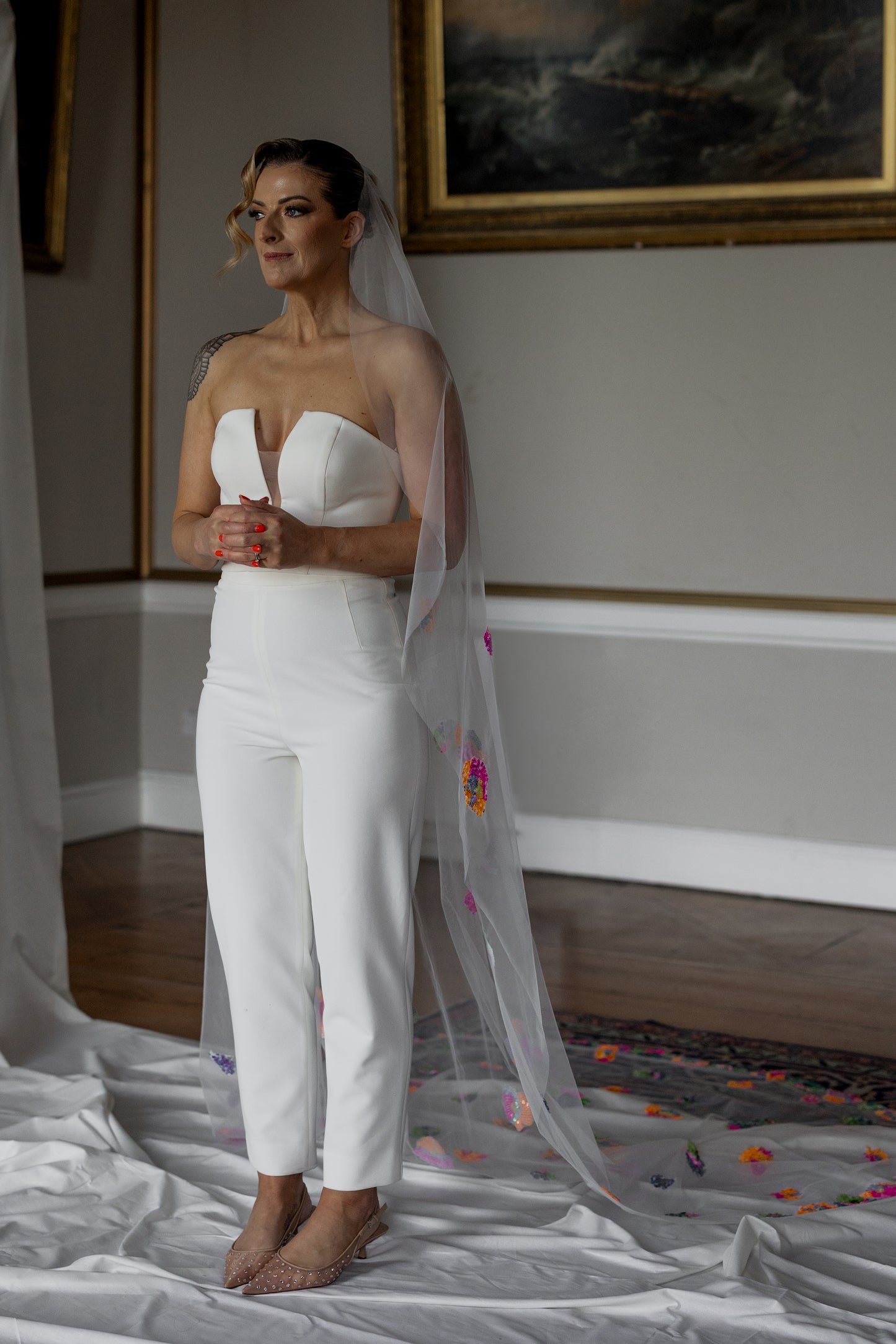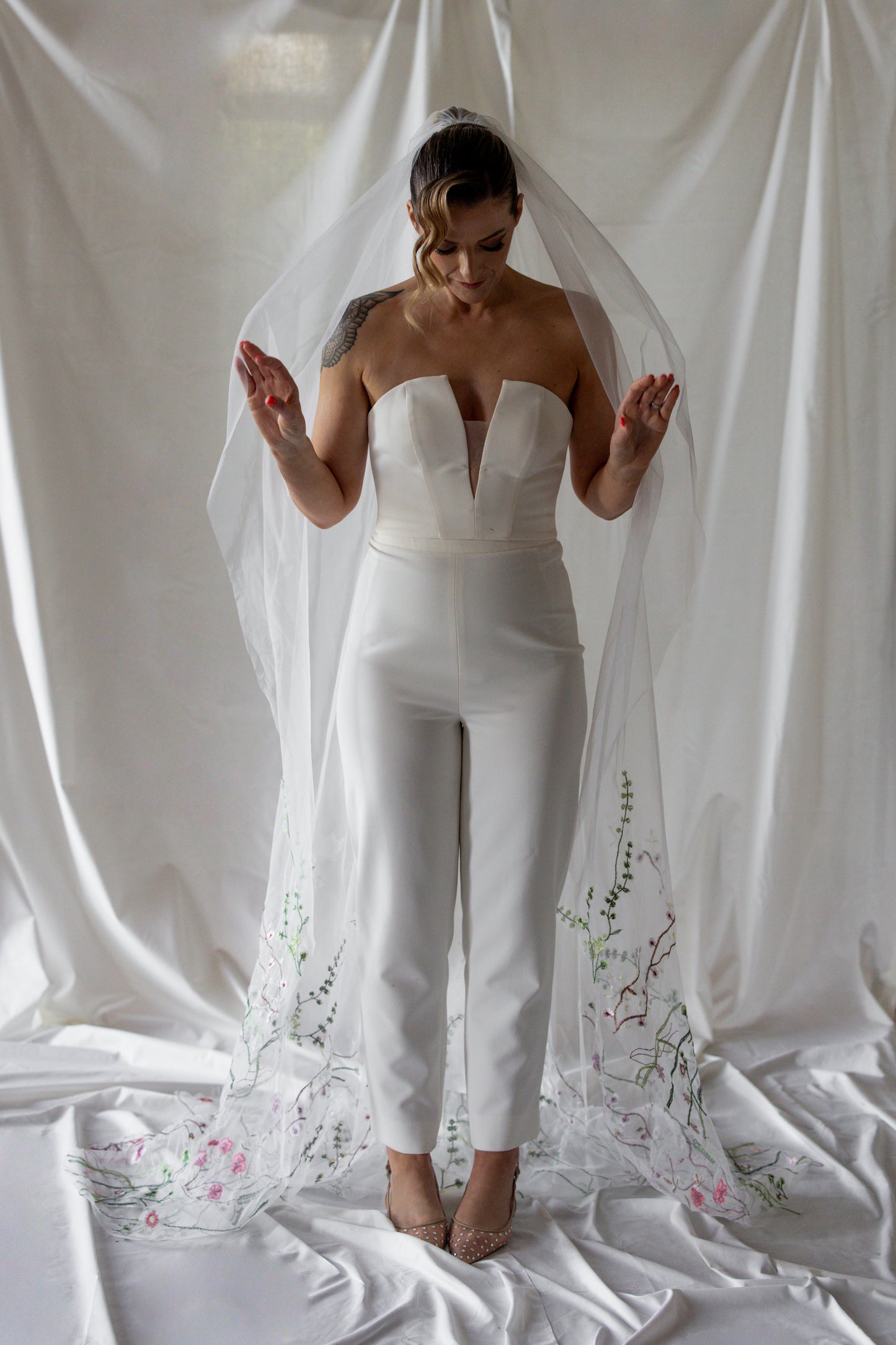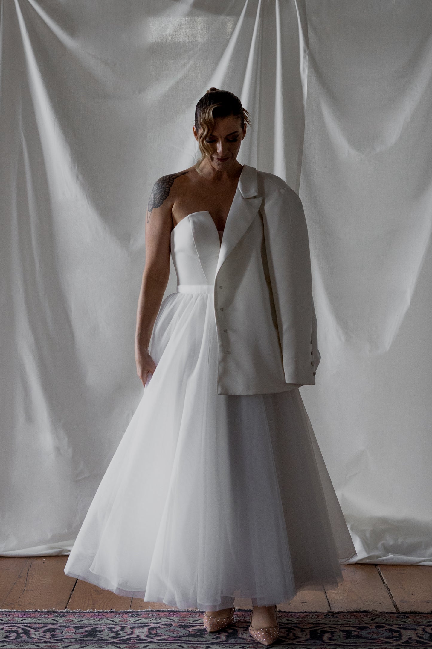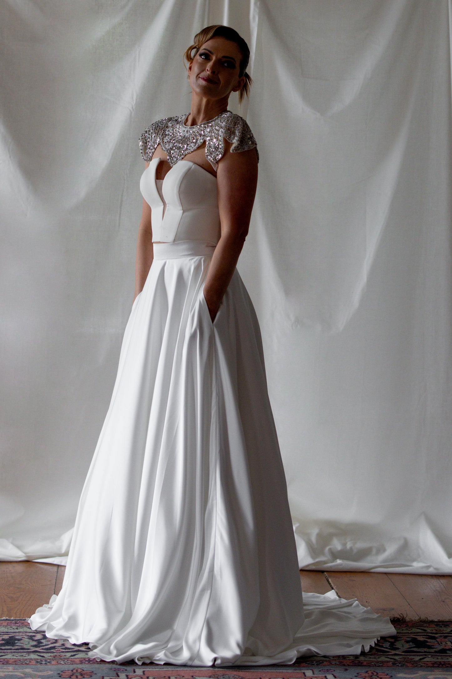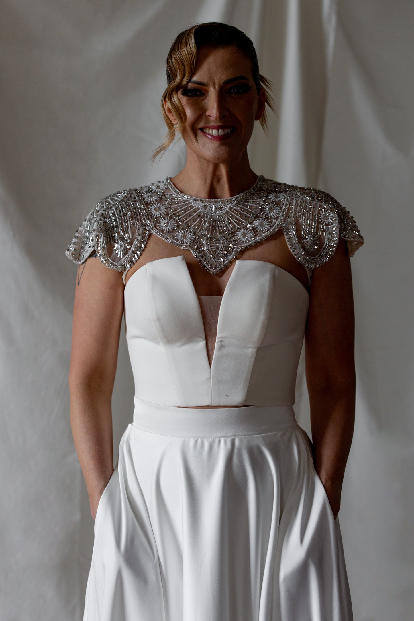 Sleek and sculptural, this crepe top features a bold plunging neckline balanced by a discreet illusion panel for subtle coverage. The clean lines and fluid drape of the fabric create a modern, minimalist silhouette with a confident edge. Refined yet daring, it’s the perfect pairing of structure and sensuality.